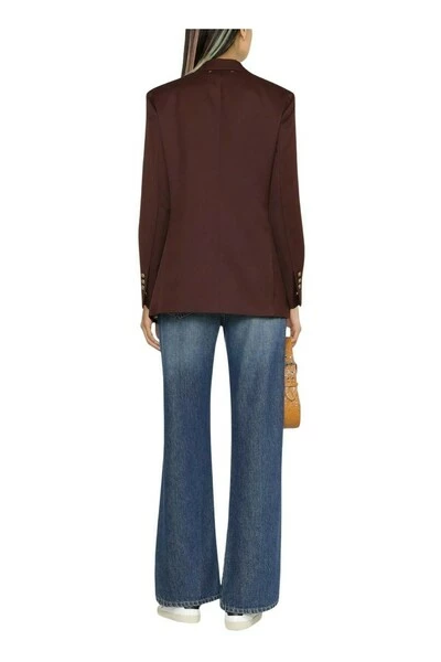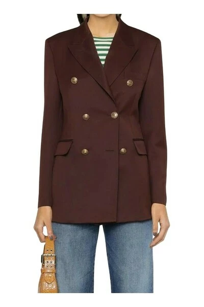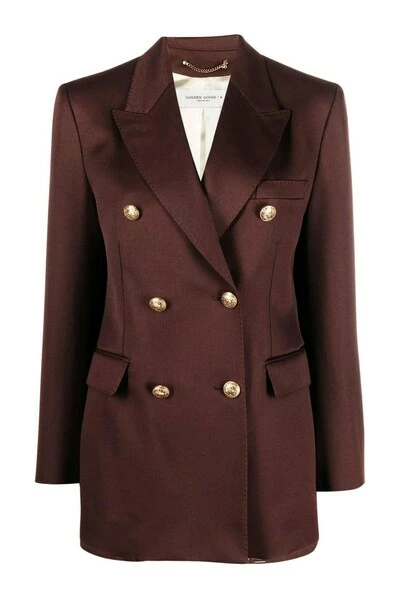 Bruine blazer van Golden Goose. Dit ontwerp met lange mouwen met lange mouwen heeft knoppen met een verhoogd patroon, piek revers, twee flapzakken en een slipzak.