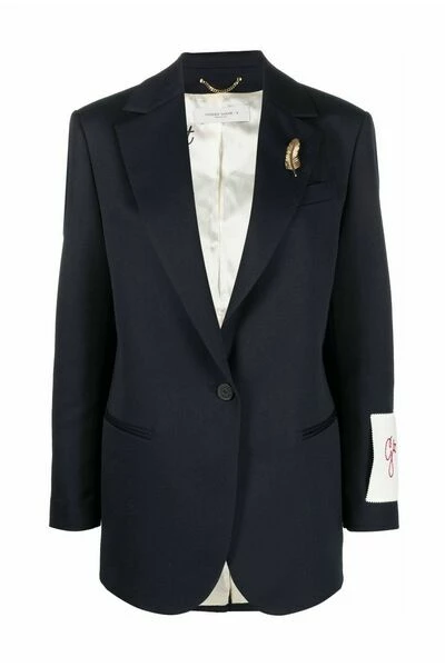Golden Goose Jackets Blue Navy Virgin Wool Blend Tom Boy Logo-Patch Blazer van Golden Goose met gekke revers, broche-details, knoopknoopbevestiging, borstspaszak, twee voorste zakken, lange mouwen, lange mouwen, logo-patch bij de mouw en geknoopte manchet.