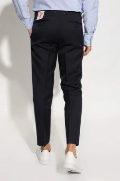 Marineblauwe plooi-voorkant van Golden Goose. Geërgdeerd met een crème en rode logo -patch, valt dit paar met licht taps toelopende benen en heeft een ritssluiting met een knop, twee slipzakken en twee knopenzakken.