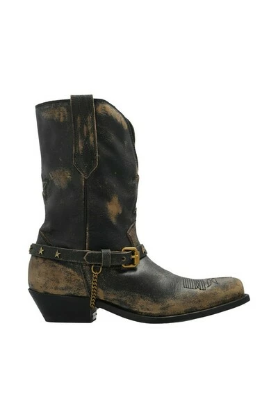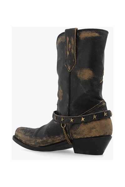 Brown ‘Wish Star’ cowboylaarzen met een vintage effect van Golden Goose. Gemaakt van leer, dit paar is compleet met een geborduurd patroon, verstelbare gesp riem met een ketting, het merk s kenmerkende sterapplicaties in goudkleurige en zwarte lederen zool.