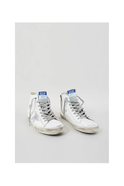 White Golden Goose Francy hoge sneakers met veters. Gemaakt van leer, suède en rubber. Goudkleurige rits aan de zijkant. Versierd met een zilverkleurige suède ster patch aan de zijkant. Geperforeerd, Francy-logo op de zijkant, blauw GGDB-logo op de tong, vintage veren effect, witte rubberen zool.