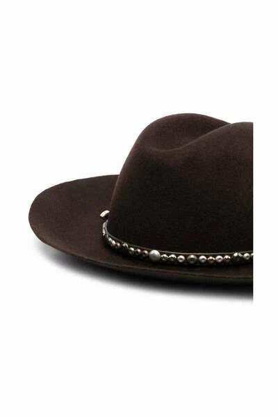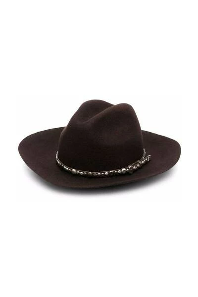 Bruine side buckle bevestiging, zilverkleurige stud-verfraaiing, brede rand. Samenstellingsstof 100%
