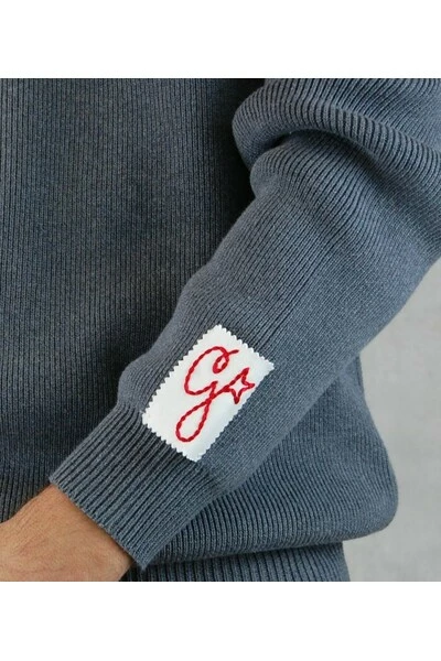 Jersey Golden Goose Sweatshirt. Jungle jersey grijze lange mouw en ronde hals. Letters genaaid op de rug en detail van twee metalen sterren op de nek. Het model meet 182 cm, weegt 80 kg en draagt de L.