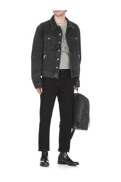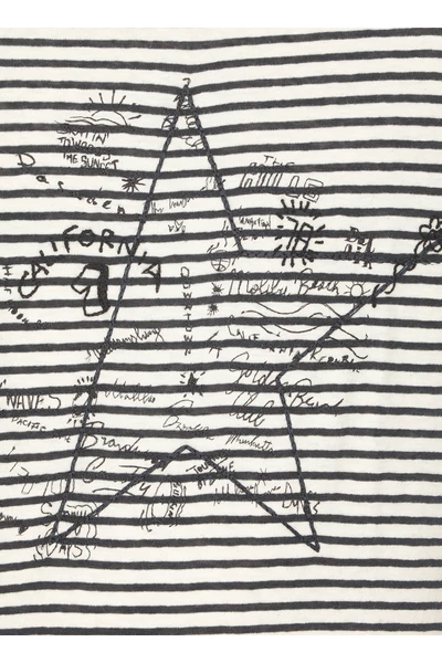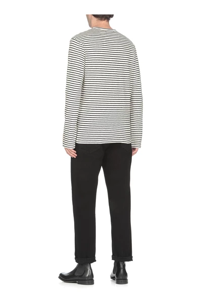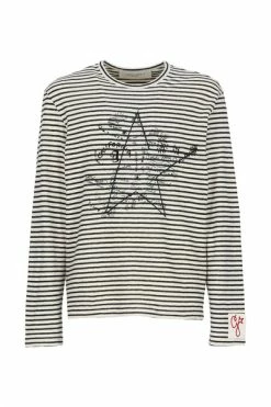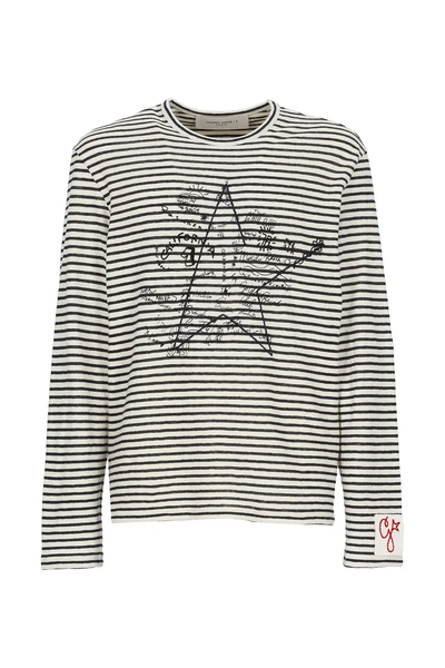 Golden Goose T -shirts en polo`s – Wit en blauw gouden ganzen katoen en linnen T -shirt voor man – gestreepte patroon – Crew -halslijn – Lange mouwen – Patch met contrasterend kleur geborduurd logo op linker mouw – voorste toon op toonborduurwerkzaamheden