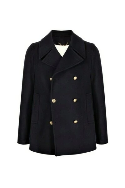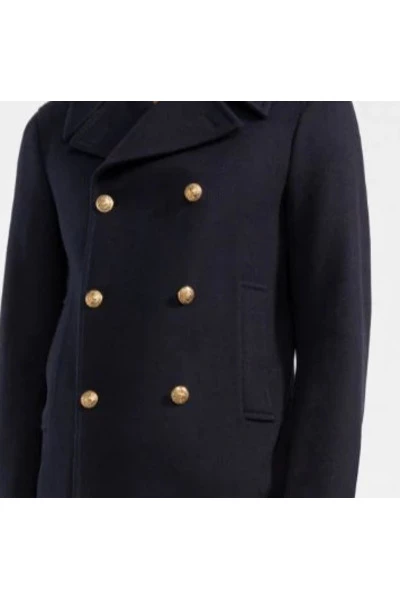 Golden Goose Giacconi Blue Double -Breasted Coat Cortomodello Dandy, door de Fit Regular wordt gekenmerkt door het sluiten van heraldische knoppen van gouden kleur en door de witte stempel van witte kleur met de fijn geborduurde rode G -letter. – Past regelmatig – Dubbelbruiled model – dubbele gouden ster aan de achterkant – collectie in galm – twee voorzakken – verwijderbare witte stempel – sluiting met gouden heraldische knoppen – 80% buitenwol maagd 20% polyamide – 64% viscose 36% rayon – Kol. Blue – gemaakt in Italië