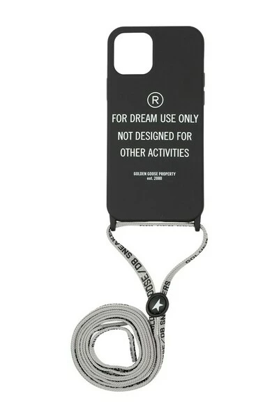 Black iPhone 12/12 Pro Case van Golden Goose. Versierd met een gedrukt patroon in het wit, is het compleet met een verstelbaar kant in grijs.