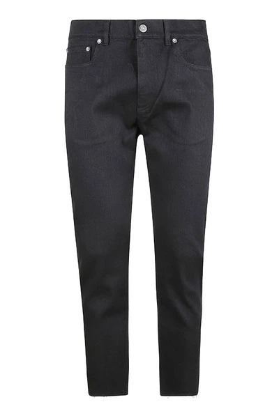 Vijf zakken jeans, zip sluiting en knop, lasersnijden op de bodem. 100% katoen.