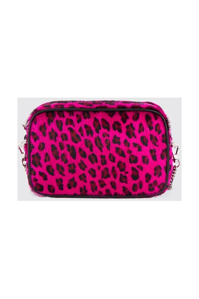 Golden Goose Tassen .. Golden Goose Mini Star Bag gemaakt van Fuchsia Leopard Pony Skin. Zilverkleurige kettingschouderriem met dromende letters. Contrasterende logo -letters aan de voorkant. Zwarte lederen ster aan de voorkant aangebracht. Één binnenzak.