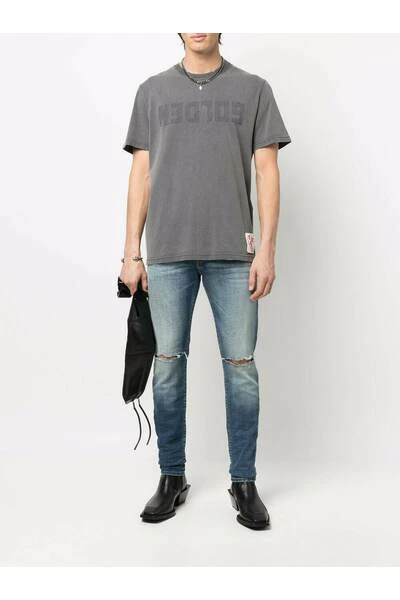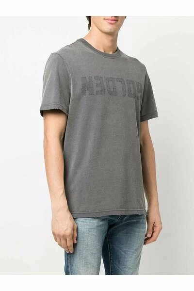 Donkergrijs t-shirt met een vintage effect van Golden Goose. Gemaakt van katoen, dit ontwerp beschikt over een logo, de kenmerkende patch van het merk met een rood monogram borduurwerk, de iconische metalen ster -applicaties aan de achterkant, geribbelde bemanningshals en korte mouwen.