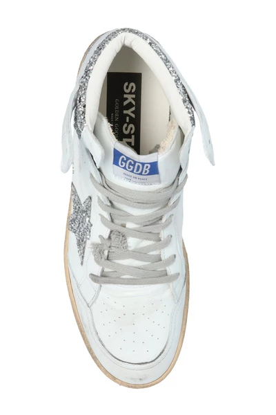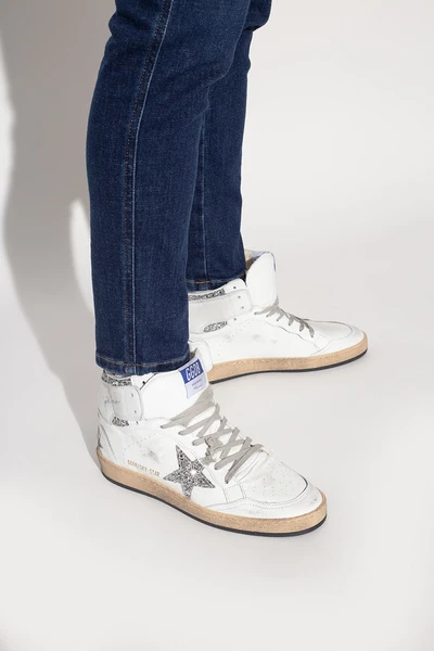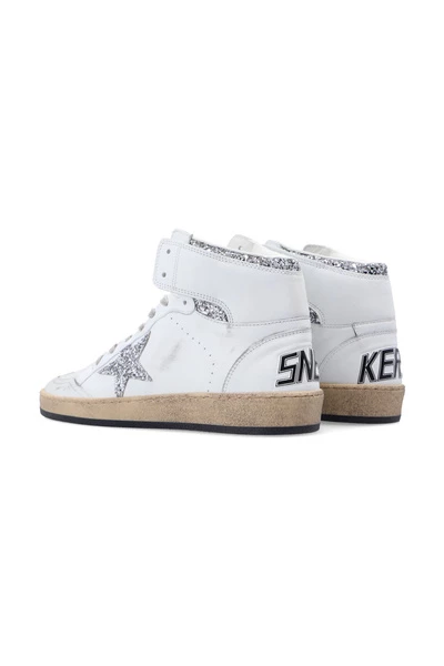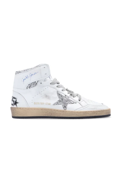 Witte ky-Star&; Golden Goose-sneakers met veters en een vintage desing, gedragen effect. Gemaakt van leer. Perforatie op de teen. Een opgenaaide iconische glinsterende zilverkleurige ster aan de zijkant. Goudkleurig metallic en donkerblauw logo bedrukt op de zijkant. Zwart en beige rubberen zool.