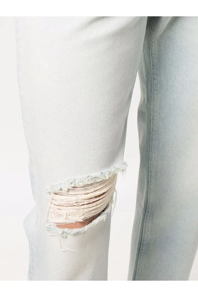 Blue Cotton Distressed Straight-been jeans uit gouden gans met noodlijdende afwerking, voorste knoopsluiting, riemlussen, klassieke vijf zakken en rechte been.