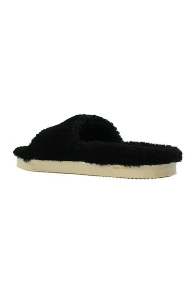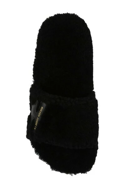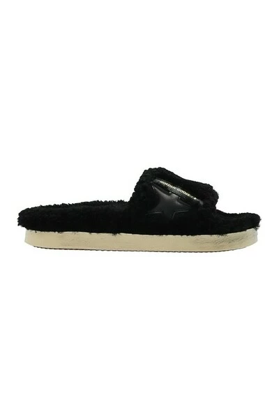 Zwarte ‘poolstar’ bont glijdt van Golden Goose. Gemaakt van leer, dit ontwerp beschikt over de kenmerkende ster van het label, het goudkleurige logo-patroon en beige rubberzool.