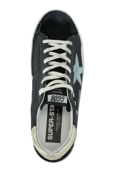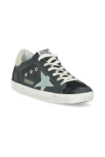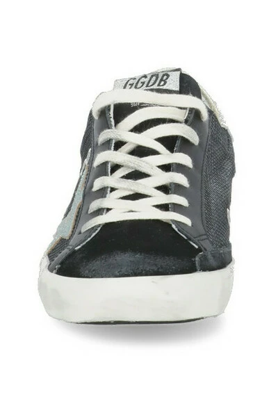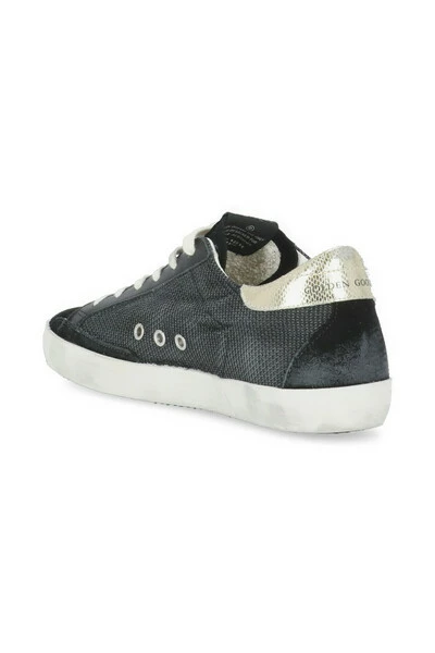 Golden Goose Sneakers – Black Golden Goose Leather Sneakers For Woman – Suede Leather Round Toe – Contrasterende kleurvetjes vooraan Versnijen – Tech Fabric Details – Golden Goose Tab bij tong met glitter – zijkant iconische ster – Golden Golden Goose -logo bij Upper Heel – Rubber Sole