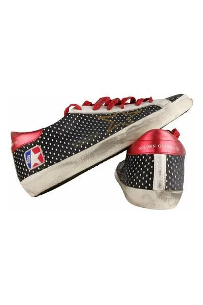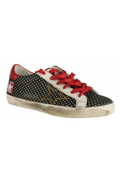 Gouden ganzen sneakers in leer bedekt met zwarte gaasstof, rode glitter snaren, gestikte sterlogo en terug in rood octrooieleer, 100% leer, rubberen zool. Gemaakt in Italië