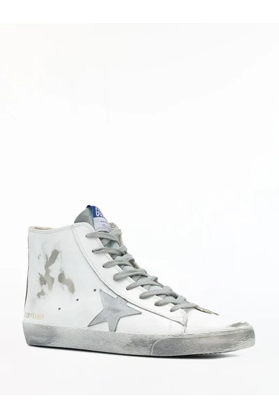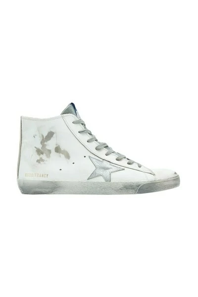 Hoge sneakers in vintage-effect wit leer met rubberen zool, zijzip, voorveter, grijze suede tong met logo, zilveren zijster, GGDB / Francy-logo en zijtoepassing met Francy-logo in zwart.