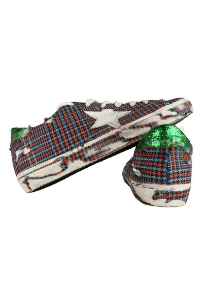 Gouden ganzen sneakers in leer volledig bedekt met stof met veelkleurig Houndstooth -patroon, rug met groene glitter, sterlogo in wit leer, 100% leer, rubberen zool. Gemaakt in Italië