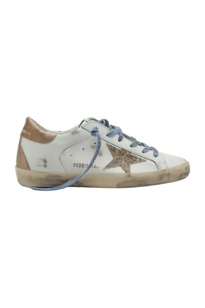 Golden Goose Sneakers wit Deze superster-sneakers in wit leer worden gekenmerkt door een bronzen gekleurde geribbelde hieltabblad en een glitterster met luipaard-print. Als een finishing touch, lila veters met contrasterend zwart logo. Details: – Stijl GWF00102 F002491 10883 – Witte kleur – Glitter Leopard Star – Bronze gekleurde geribbelde achterste patch – Gekleurde veters met contrasterend zwart logo – Vintage behandeling