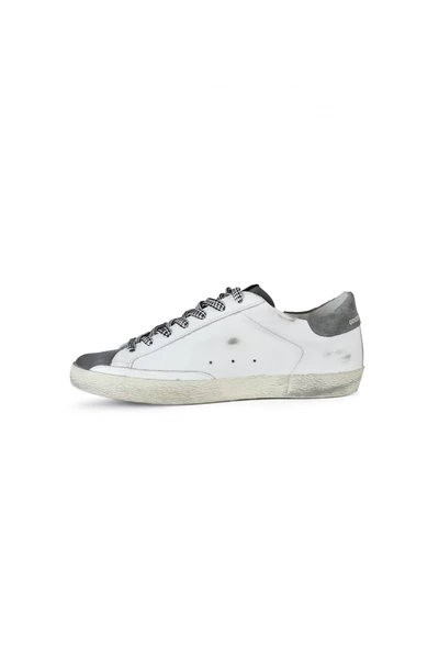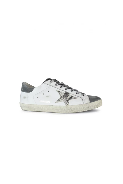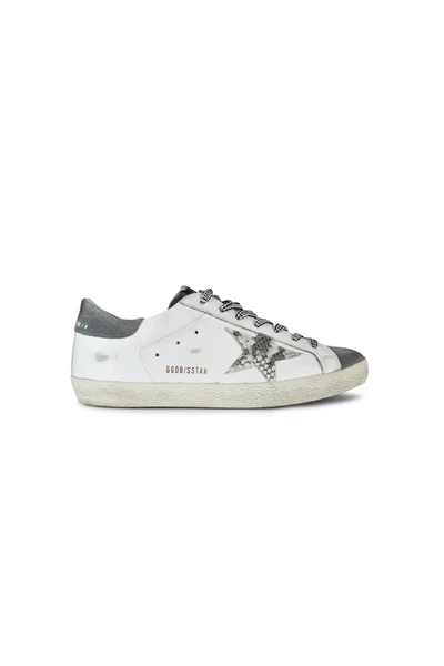 Golden Goose Deluxe merk Superstar sneakers. Wit leer en grijze suede.python Print Star Patch.Grey Suede Counter.wite en zwarte veters.logo details aan de buitenkant. Rubberzol.