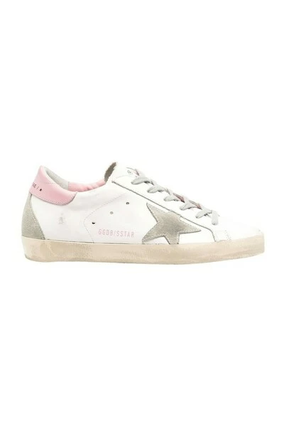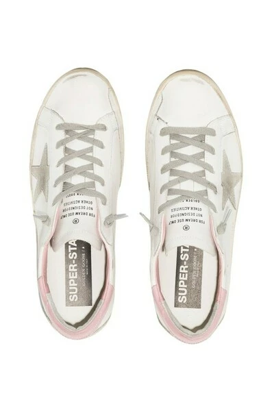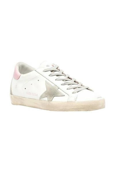 Golden Goose Sneakers witte superster verontruste veter trainers van Golden Goose met wit, roze, leer, bedroefd effect, kenmerkende sterspatch aan de zijkanten, veterbevestiging vooraan, ronde teen en platte rubberen zool.