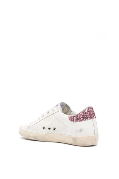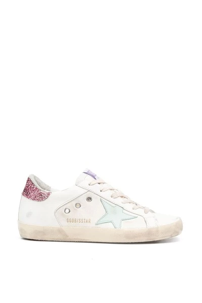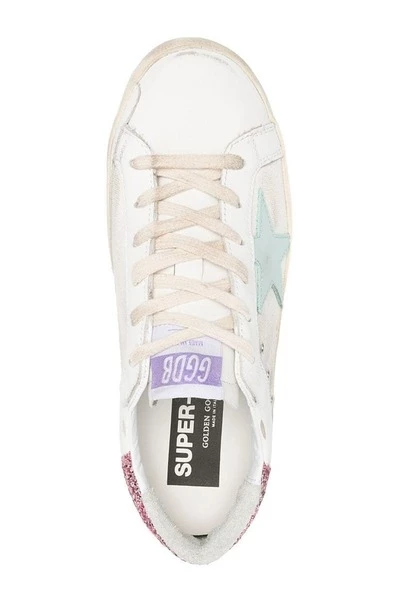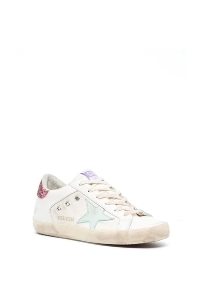 Golden Goose Sneakers Super-Star low-top sneakers van Golden Goose met wit/multicolour, kalf leer, noodlottig effect, oogetdetails, logo-print naar de zijkant, kenmerkende sterrenpleister naar de zijkanten, logo-patch bij de tong, contrasterende hielteller, Ronde teen, veterbeperking en rubberen zool.