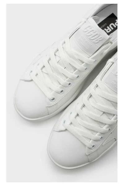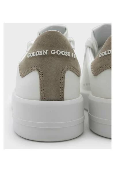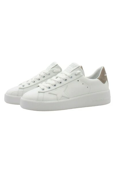 Pure Star Sneakers van Golden Goose met een karakteristieke sterrenpleister gemaakt van wit leer. De schoen heeft een veterafsluiting aan de voorkant en een taup -gekleurde geraulde leider op de hiel. De Golden Goose -branding bevindt zich op de tong. Materiaal Zorgmateriaal: 100% Cowhide of Feed: 86% Cowhide, 14% katoen, Sole: 100% Rubber Details Kleur: Wit, Taupe | Wit, taupe gemaakt in: Italië Stijl nr.: GWF00197.F002786.10961