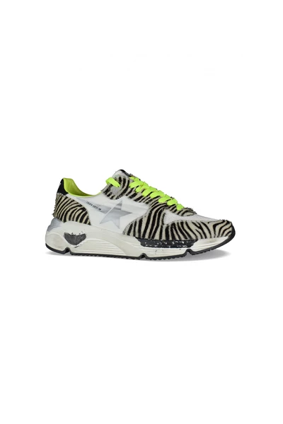 Golden Goose Running Sneakers.Foal bovenwerk met zebra print.grey gedrukte ster. Black lederen bovenwerk met GGDB-logo.fluorescerende veterafsluiting. Overgevoelde zool met verfvlekkeneffect. Gemaakt in Italië.