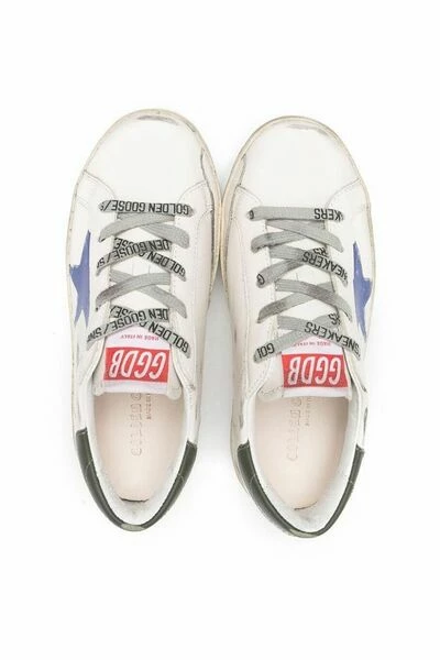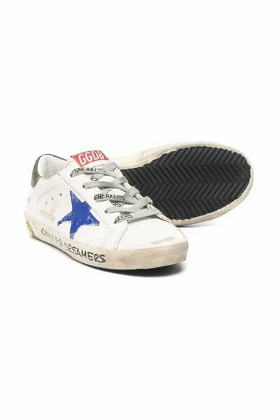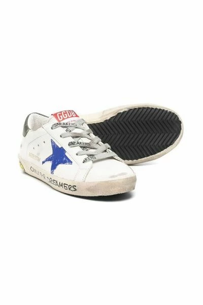 Golden Goose sneakers wit wit lederen superster low-top sneakers van Golden Goose Kids met platte rubberen zool, logo-print aan de zijkant, sterspatchdetail, veterbevestiging vooraan, ronde teen, logo-patch bij de tong en contrasterende hielrecht.