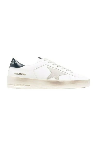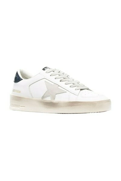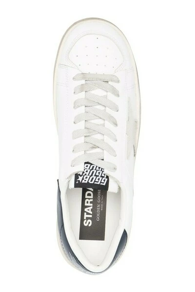 Wit/zwarte sneakers, ronde teen, vetersluiting aan de voorkant, platte rubberen zool.