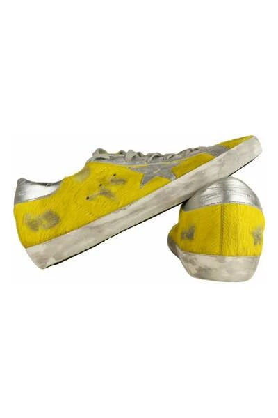 Gouden ganzen sneakers in leer bedekt met geel ponyhaar, sterrenlogo en andere onderdelen in zilveren octrooieleer, 100% leer, rubberen zool. Gemaakt in Italië