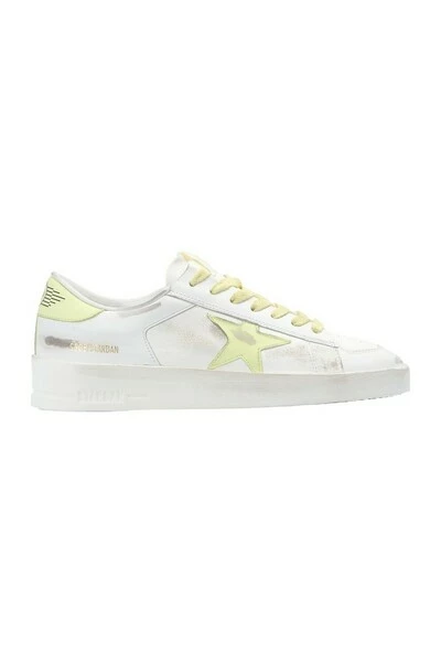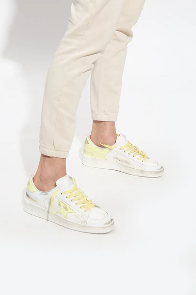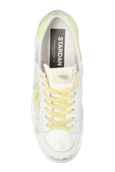 Witte ‘Stardan’ sneakers van Golden Goose. Dit model met vetersluiting is gemaakt van leer en staat op een beige rubberen zool. De details zijn verweerd en het kenmerkende sterretje van het merk is geel.