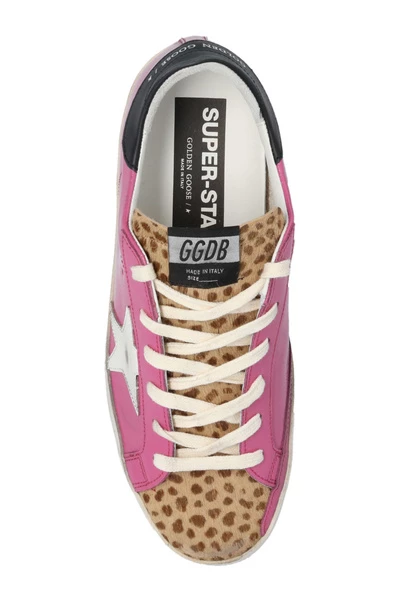Roze en bruine Superstar Classic sneakers met vintage effect van Golden Goose. Dit paar veterschoenen is gemaakt van lakleer en heeft een tongpatch, haarversieringen met een luipaardprint, een goudkleurig reliëflogo, de iconische sterpatch en een rubberen zool in crème en bruin. Materiaal: Buitenlaag: leer Binnenlaag: leer, stof Zool: rubber Productstijl-ID: GWF00101F00257745355 Deze beschrijving is automatisch vertaald.