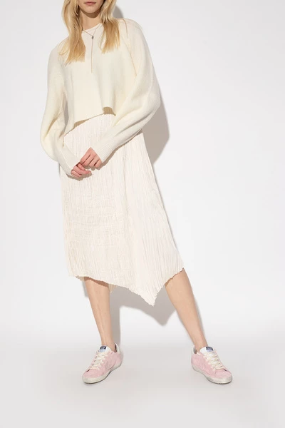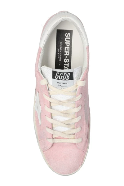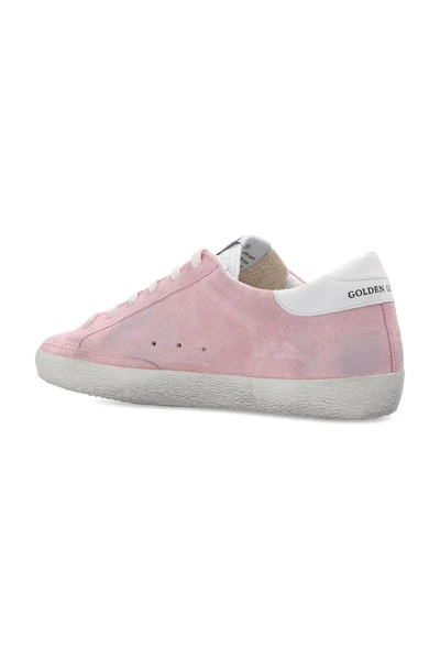 Helderroze en witte ‘Super-star Clic’ sportschoenen met vintage-effect van Golden Goose. Deze veterschoenen zijn gemaakt van suède en hebben een gestructureerde tong met patch, een goudkleurig logo in reliëf, de kenmerkende ster van het merk en een crèmekleurige en bruine rubberen zool.