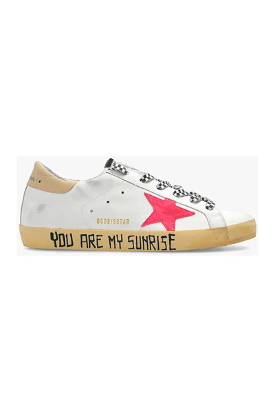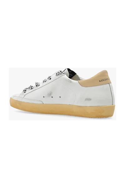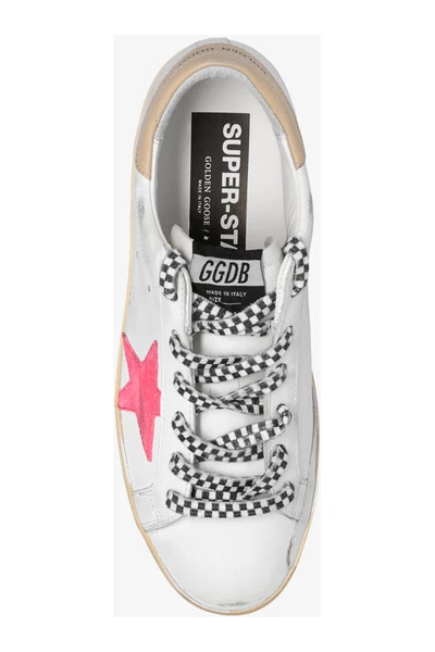 Witte ‘Super-Star Classic’ sneakers van Golden Goose. Gemaakt van leer, dit veterpaar heeft de kenmerkende roze ster, het logo-patroon, het vintage effect en beige rubberen zool van het label.