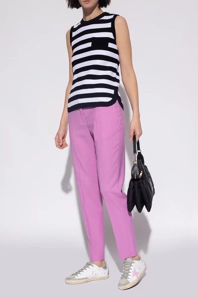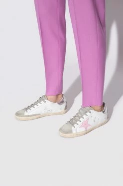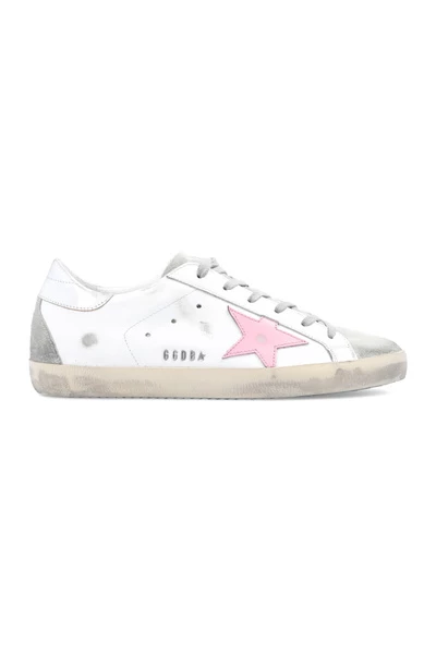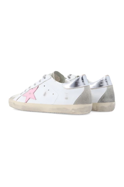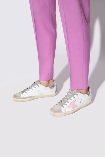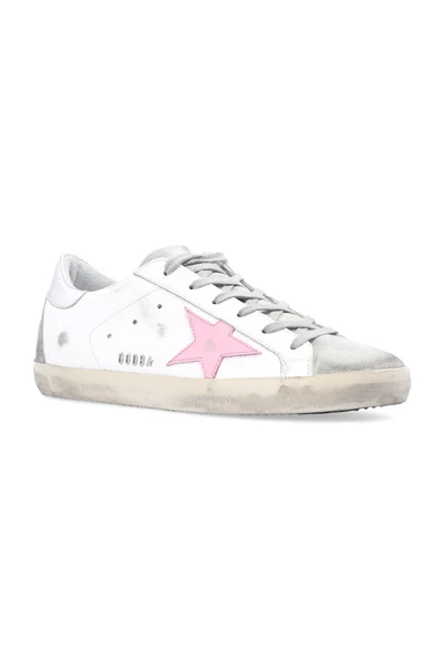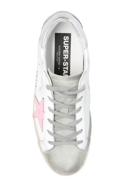 Witte, grijze en roze Super-Star sneakers van Golden Goose. Dit model met vetersluiting is gemaakt van leer met veren effecten en heeft een patch, een logo-applicatie, een zilverkleurig inzetstuk en een zwarte rubberen zool.