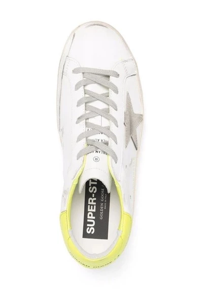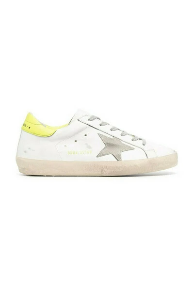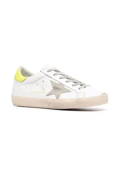 White Golden Goose Super Star lage sneakers gemaakt van leer. Kenmerkende grijze suède sterpatch aan de zijkant, geel logo aan de zijkant en gele hielkap. Vintage, veren effect. Crème rubberen zool. Ronde neus.