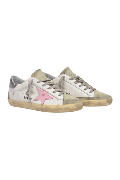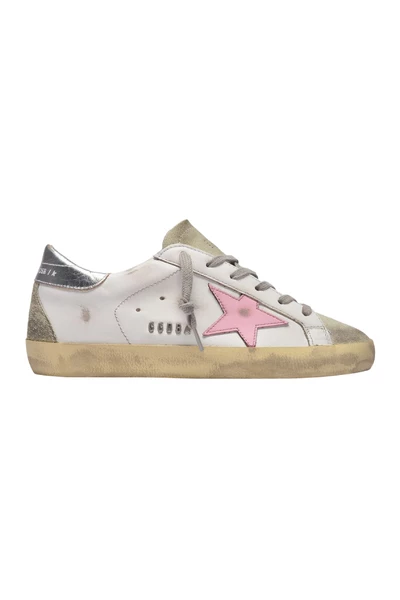 De nieuwe versies van de SuperStar van Golden Goose blijven maar komen, een must voor elke sneaker-verslaafde. Dit seizoen zijn ze er in vintage leder dat de zilveren snor op de hiel en de kenmerkende ster in lichtroze accentueert. Draag deze cultschoenen met een jeansshort en een oversized wit overhemd voor een look gestolen van de meest stijlvolle Parijzenaars.