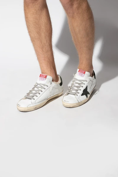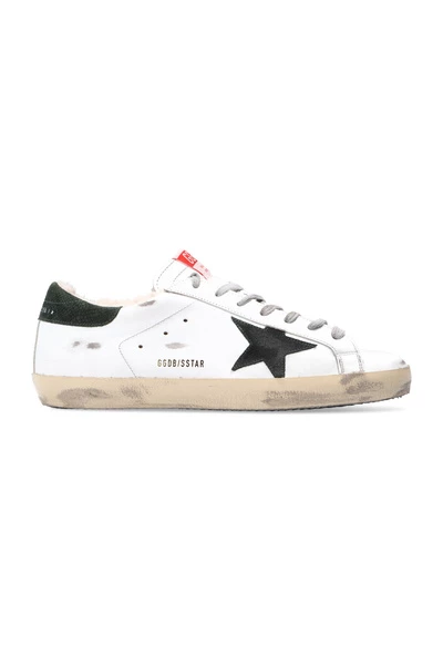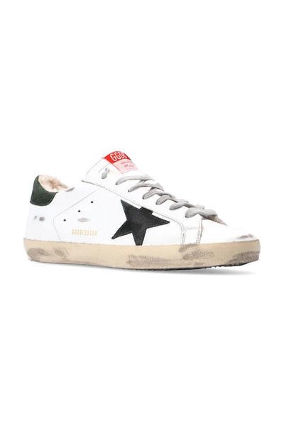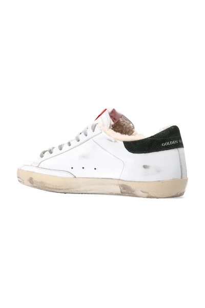 Witte Superstar Classic sneakers van Golden Goose. Dit model met vetersluiting, gemaakt van leer, zit op een crèmekleurige en zwarte rubberen zool en heeft een merklabel op de tong, verweerde effecten, een donkergroene getextureerde hielkap en een met bont gevoerd voetbed.