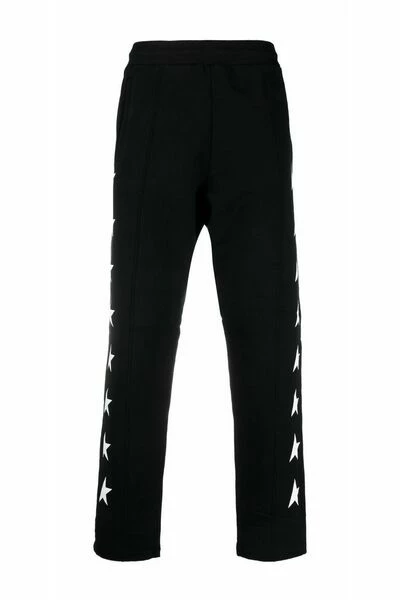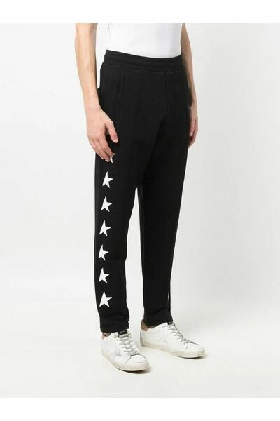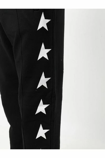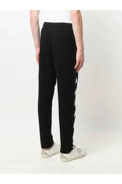 Golden Goose-broek Black Cotton Star-Motif Trackbroek van Golden Goose met sterrendruk, elastische tailleband, twee zakken spleetzakken, achterste patchzak en rechte been.Deze beschrijving is automatisch vertaald.
