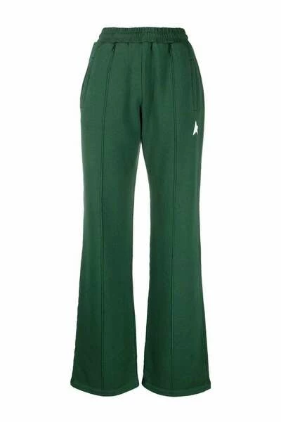 Golden Goose-broek geborduurd-logo rechte poten baanbroeken van Golden Goose met bosgroen, katoen, geborduurd logo, elastische tailleband, twee diagonale zakken aan de zijkanten en rechte been.