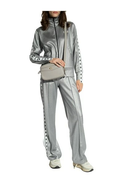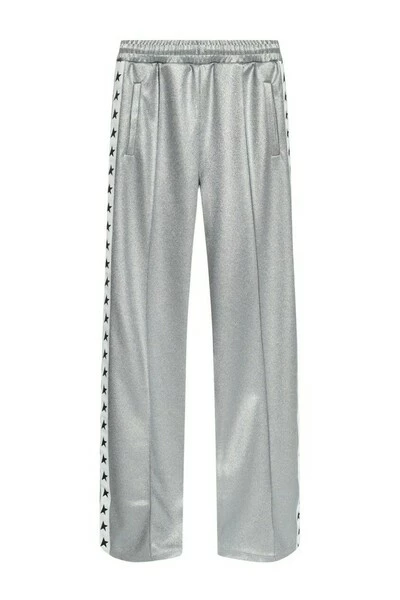 Zilverkleurige trainingsbroek van Golden Goose. Dit paar is bevestigd met trekkingsstrings en beschikt over zijstrepen met een logo -patroon, twee voorzakken, een achterzak en rechte benen.