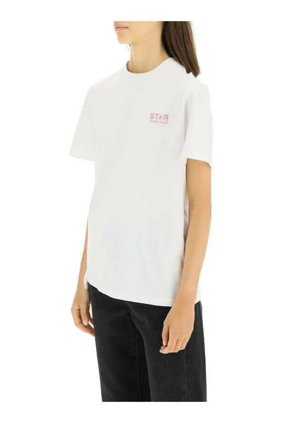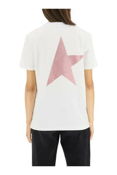Golden Goose Pure Cotton T-shirt met letterslogo print op de borst en een Maxi-ster aan de achterkant, beide glinsteren. Micro geribbeld Crewneck en regelmatige pasvorm. Het model is 177 cm lang en draagt maat XS.