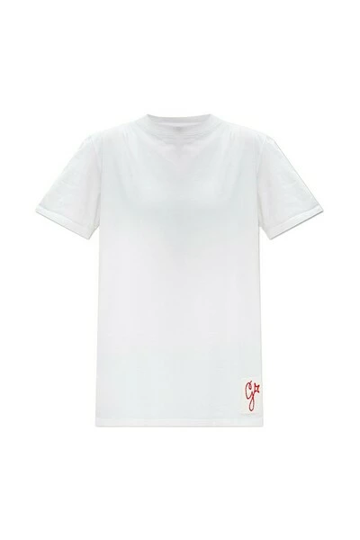 Wit T-shirt met een vintage effect van Golden Goose. Dit kledingstuk is gemaakt van katoen en beschikt over een patch geborduurd met een rood logo-borduurwerk, twee metalen ster-applicaties in antieke zilverton, geribbelde bemanningshals en korte mouwen met beurtmanchetten.