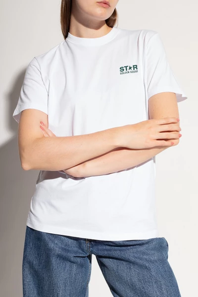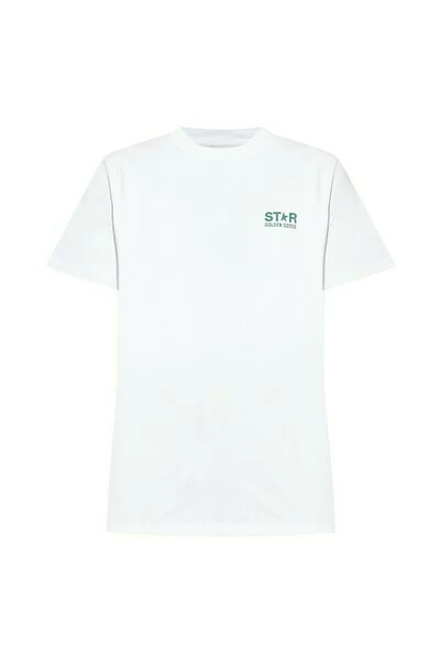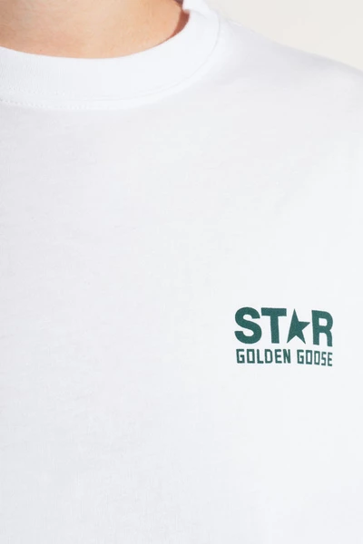 Wit t-shirt van het Crewneck van Golden Goose. Gemaakt van katoen, deze stijl heeft korte mouwen, een elastische kraag en een donkergroene grafische afdruk met het logo van het merk op de voor- en achterkant.