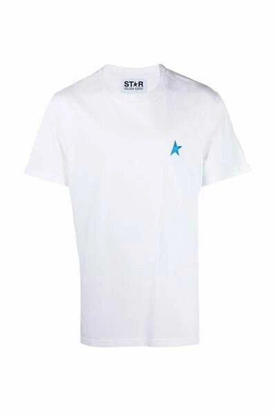 Golden Goose T-shirts en Polos Star-Print T-shirt van Golden Goose met wit, blauw, katoenen, sterrenprint, logo-print aan de borst, bemanningslid, korte mouwen en rechte zoom.
