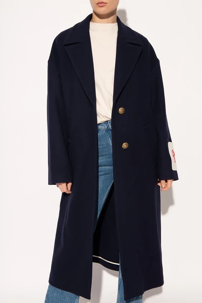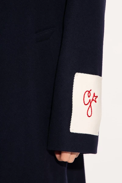 Marineblauwe jas van Golden Goose. Gemaakt van wol en versierd met een witte en rode logo -patch, deze stijl heeft decoratieve knopen, piekreuvels en twee slipzakken.