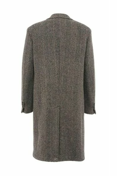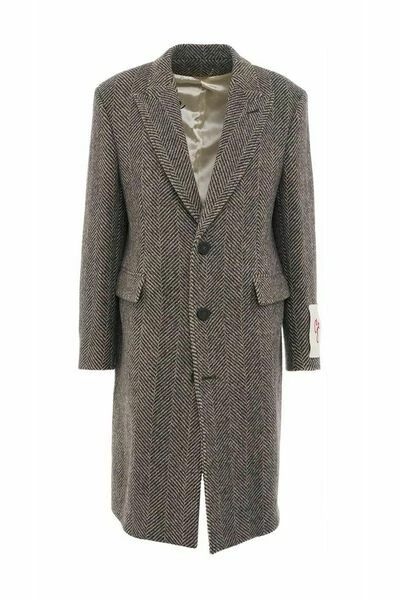 Grijze en zwarte jas van Golden Goose. Gemaakt van wol, dit kledingstukken heeft knoopbevestigingen, een visgraatpatroon, piekrapels, twee flapzakken, metalen ster-applicaties in antieke goudkleurige, enkele achteropening en lange mouwen met manchetten met knopen en patch met een rood logo-borduurwerk.