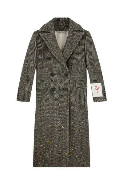 81324 Chevron beige anthraciet gele gouden dubbele borsten jas hand geschilderde chevron wol