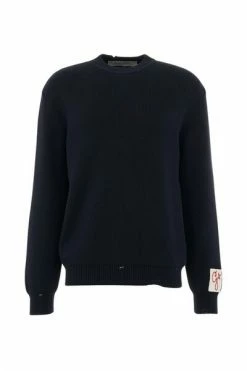 Marine geribbelde trui van Golden Goose. Gemaakt van katoen, dit kledingstuk heeft een mouwpleister met een rood logo -borduurwerk, decoratieve noodlijdende details en geribbelde randen.
