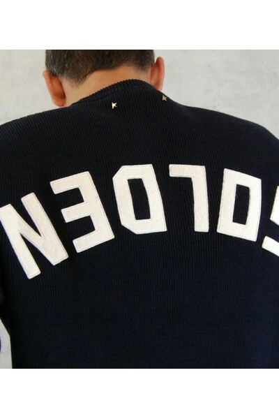 Jersey Golden Goose. Gebreide trui in marineblauw met ronde nek. Terug geborduurde teksten. Het model meet 184 cm weegt 80 kg en draagt maat M.