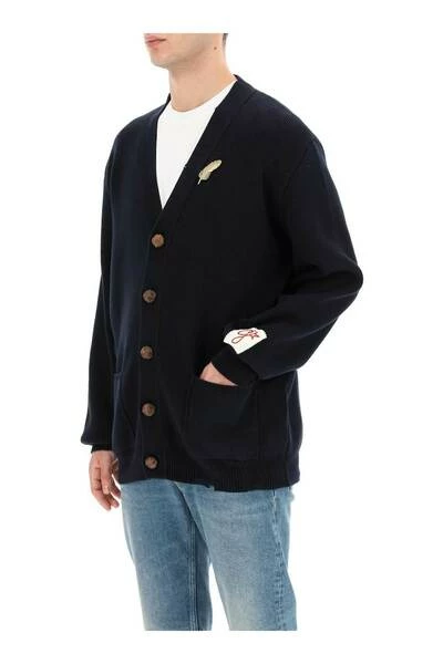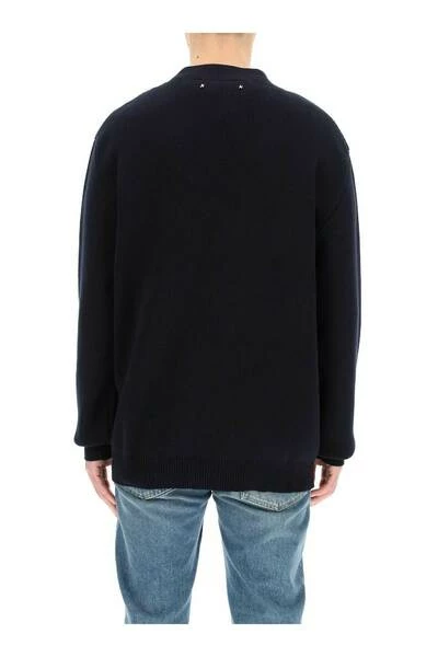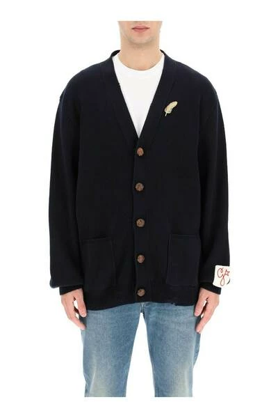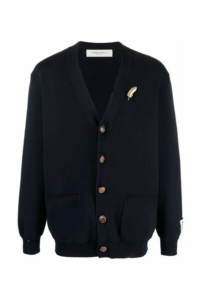 Golden Goose Sweaters blauw donkerblauw katoenen blend veer-pin gebreide vest van Golden Goose met goudkleurige hardware, noodlijdend effect, gebreide constructie, V-hals, druppelschouder, aansluiting voor knoop, lange mouwen en rechte zoom.